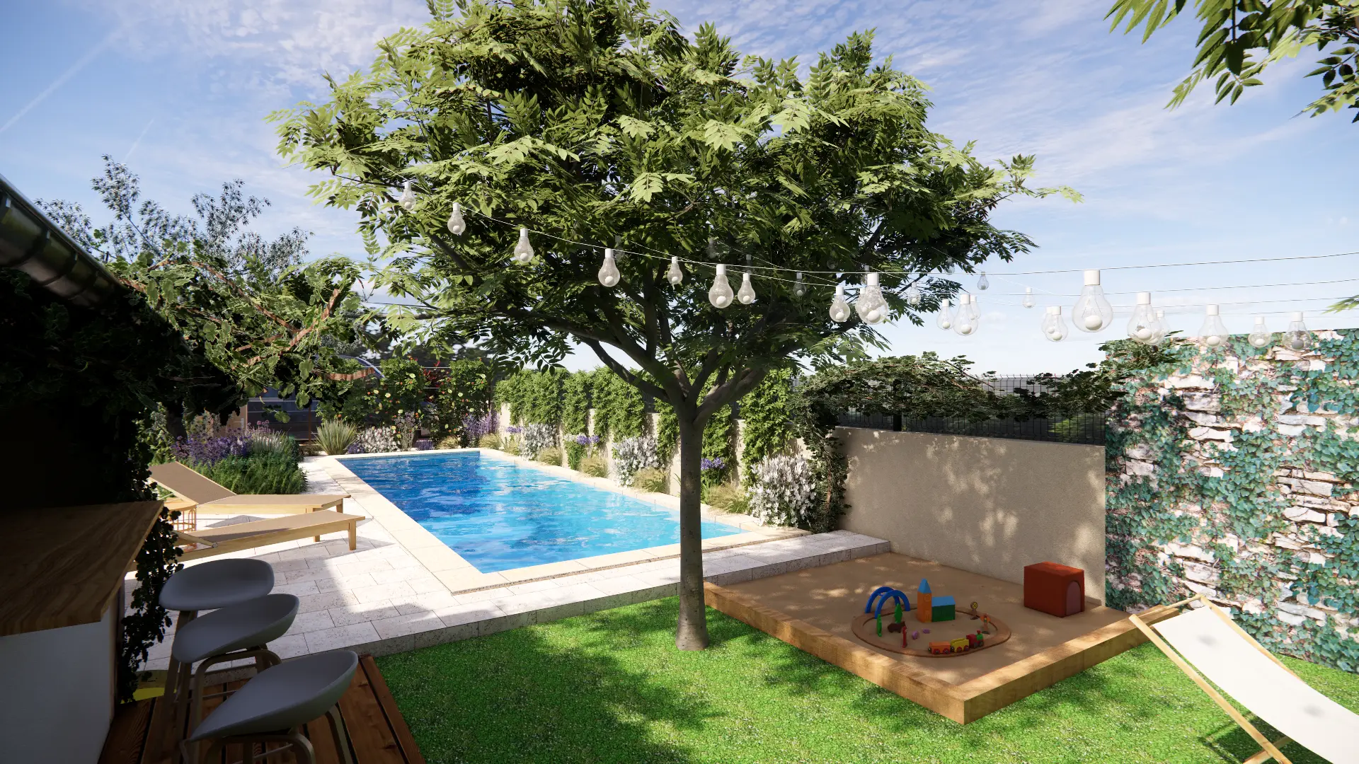 L’aire de jeux comprend un bac à sable de 2,50 x 2,50 m, offrant un espace ludique sans encombrer le jardin. La cuisine d’été, ouverte sur le jardin, est prolongée par une coursive en bois, avec des tabourets de bar pour un espace repas convivial. Une structure sur mesure en acier et bois ferme l’abri, avec une porte à galandage pour un accès facile.