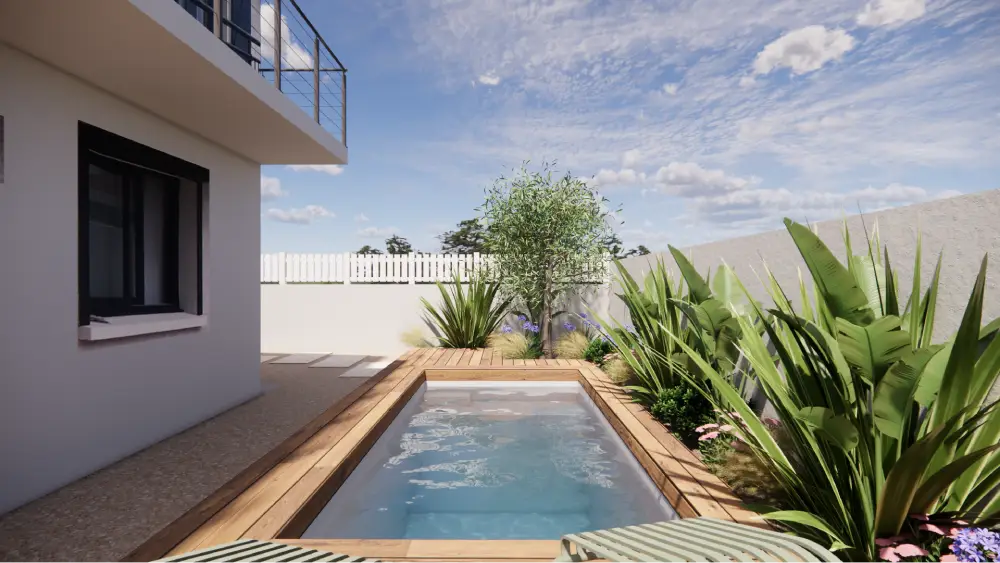 L’étude 3D et le dossier technique ont permis de proposer un aménagement haut de gamme, mêlant matériaux nobles, végétaux méditerranéens, espaces de détente, et une mini piscine sur mesure, parfaitement intégrée au projet.