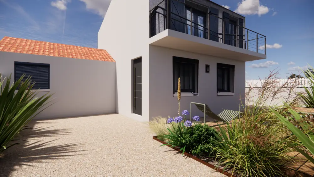Créer un jardin harmonieux, fonctionnel et chaleureux, tout en composant avec les contraintes d’un terrain rectiligne et la proximité du littoral.