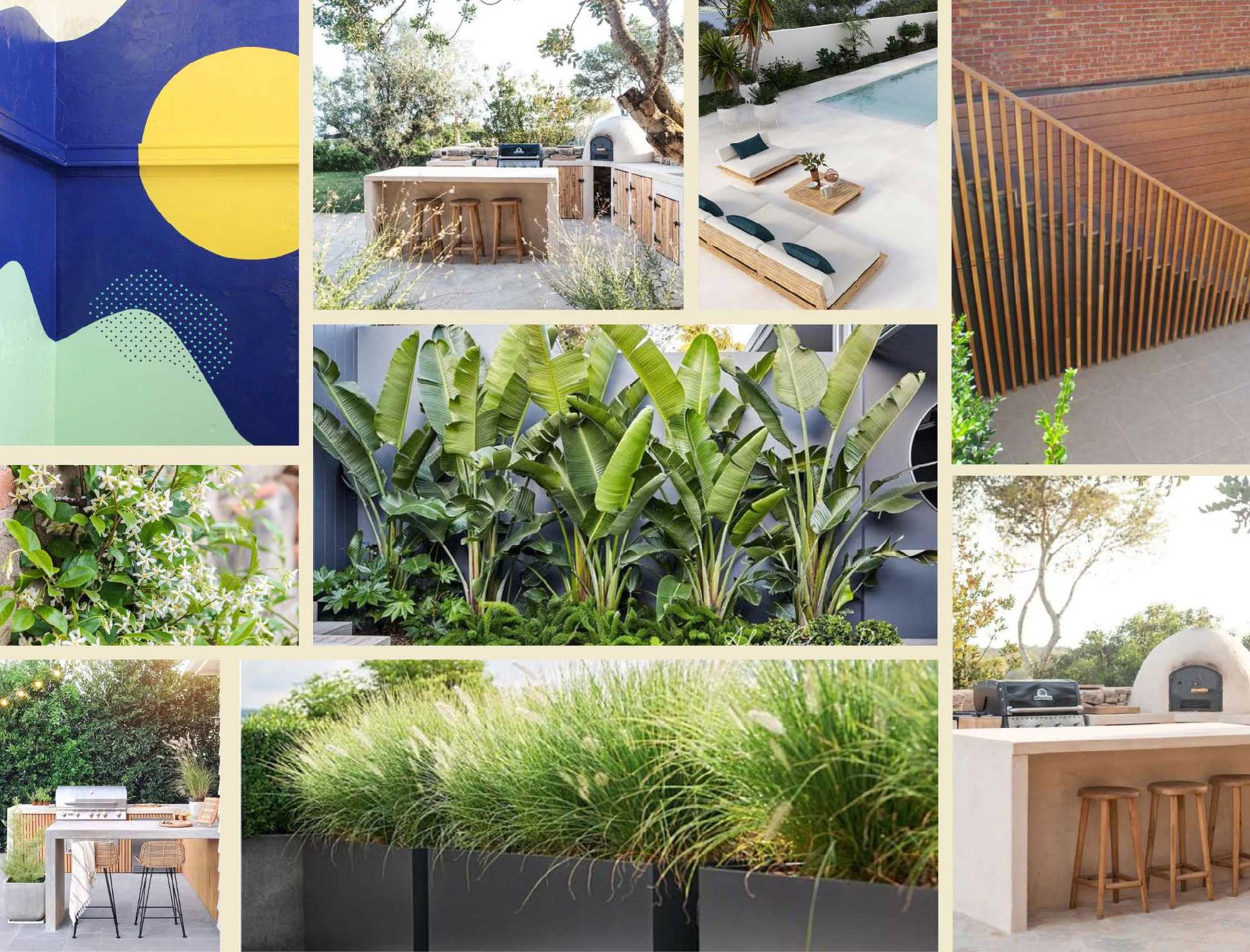Des bacs modernes dans des nuances de gris anthracite accueilleront des plantes persistantes, créant ainsi un mur végétal. Une fresque ornera le mur en renfoncement, tandis que des arbres à croissance rapide serviront de brise-vue.